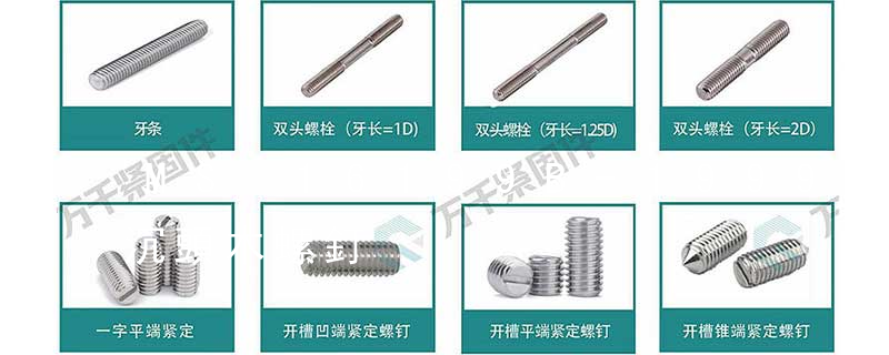 木螺釘有十字槽沉頭、十字槽半沉頭、十字槽圓頭、開槽(一字槽)沉頭、開槽半沉頭、開槽圓頭、六角頭等幾種,公稱直徑有1.6、2、2.5、3、3.5、4、5、6、7、8、10等系列,長度有6、8、10、12、16、20、25、3